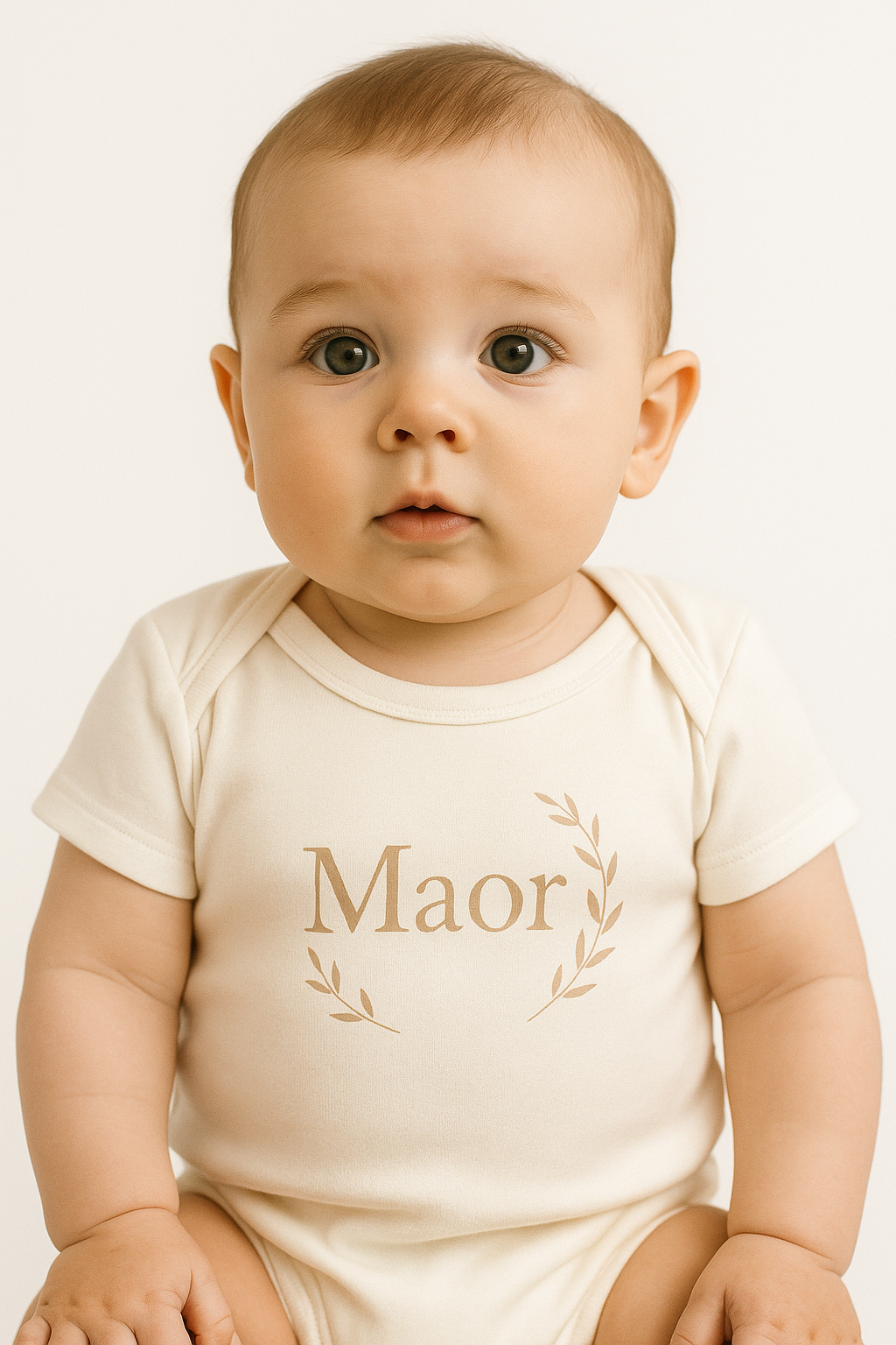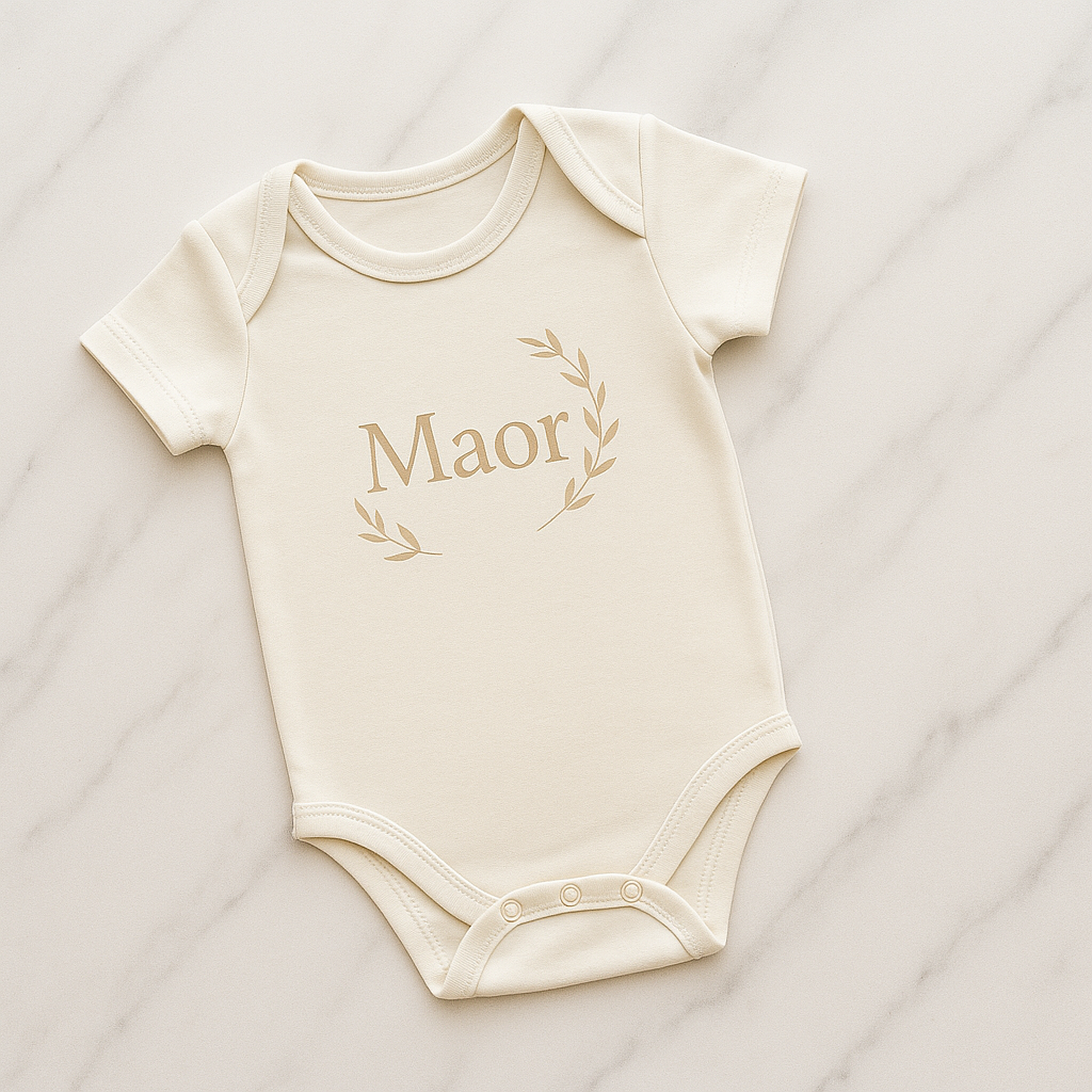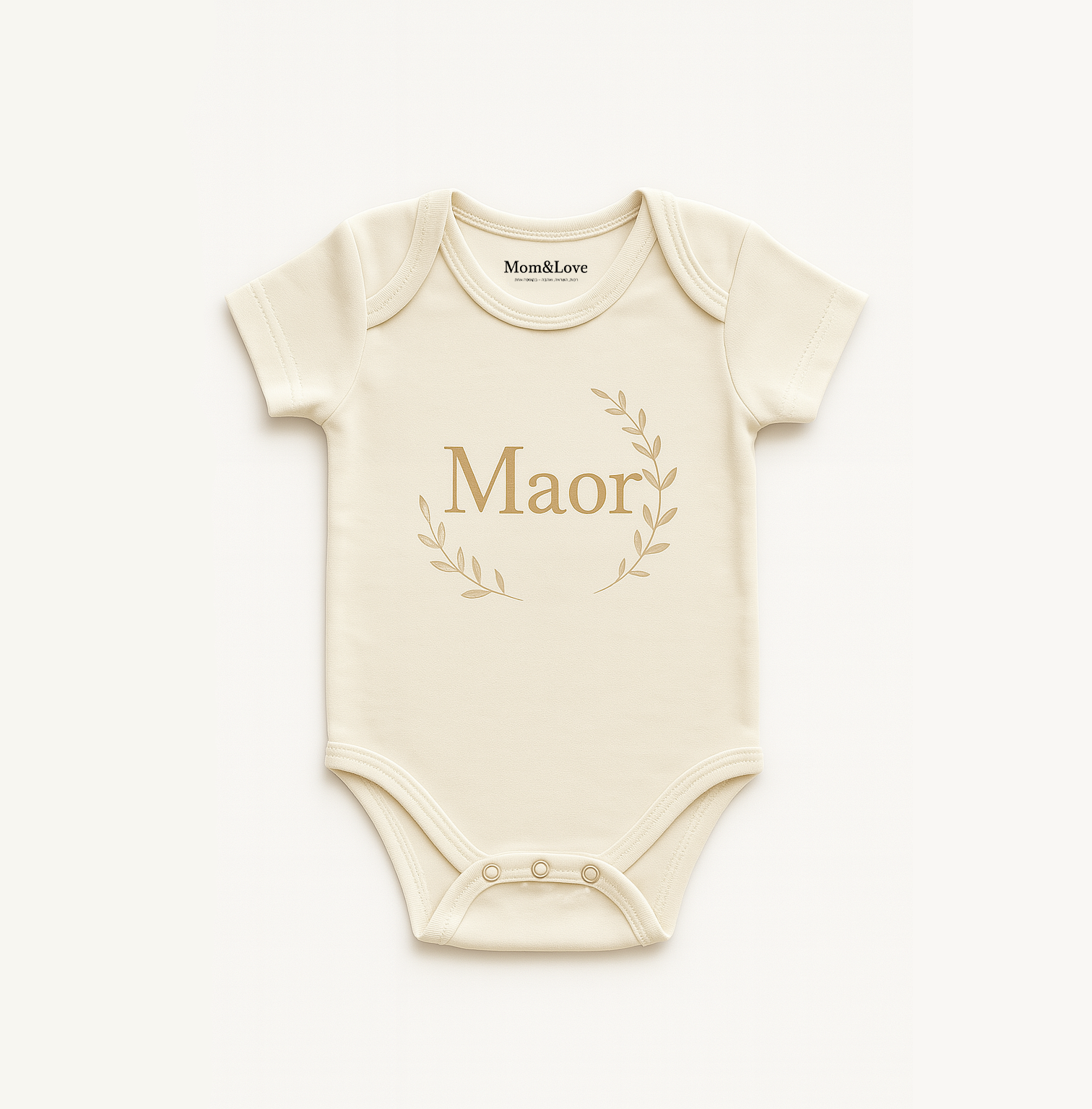 בגד גוף רך ומלטף לתינוק, עשוי 100% כותנה איכותית, עם הדפסה בעיצוב אישי של שם התינוק, מוקף בעלי זית עדינים בגוון טבעי המשתלב בהרמוניה עם הבד.